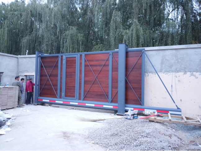 高先生選的這款懸浮門為橡木封板加鋁合金邊框,是特別高端的一款門,門總長7米5,總高3米,運行順暢,搭配原建筑的高圍墻,效果非常好。